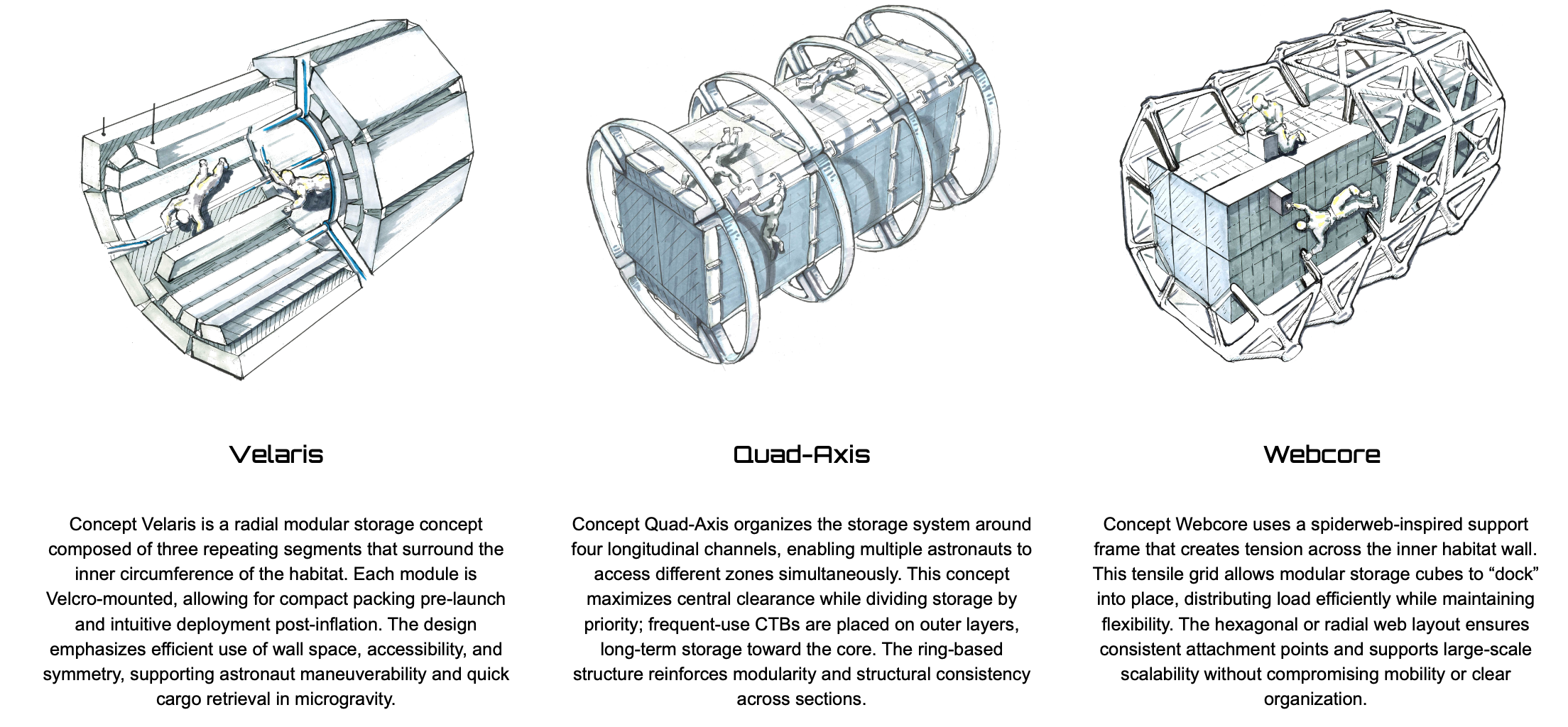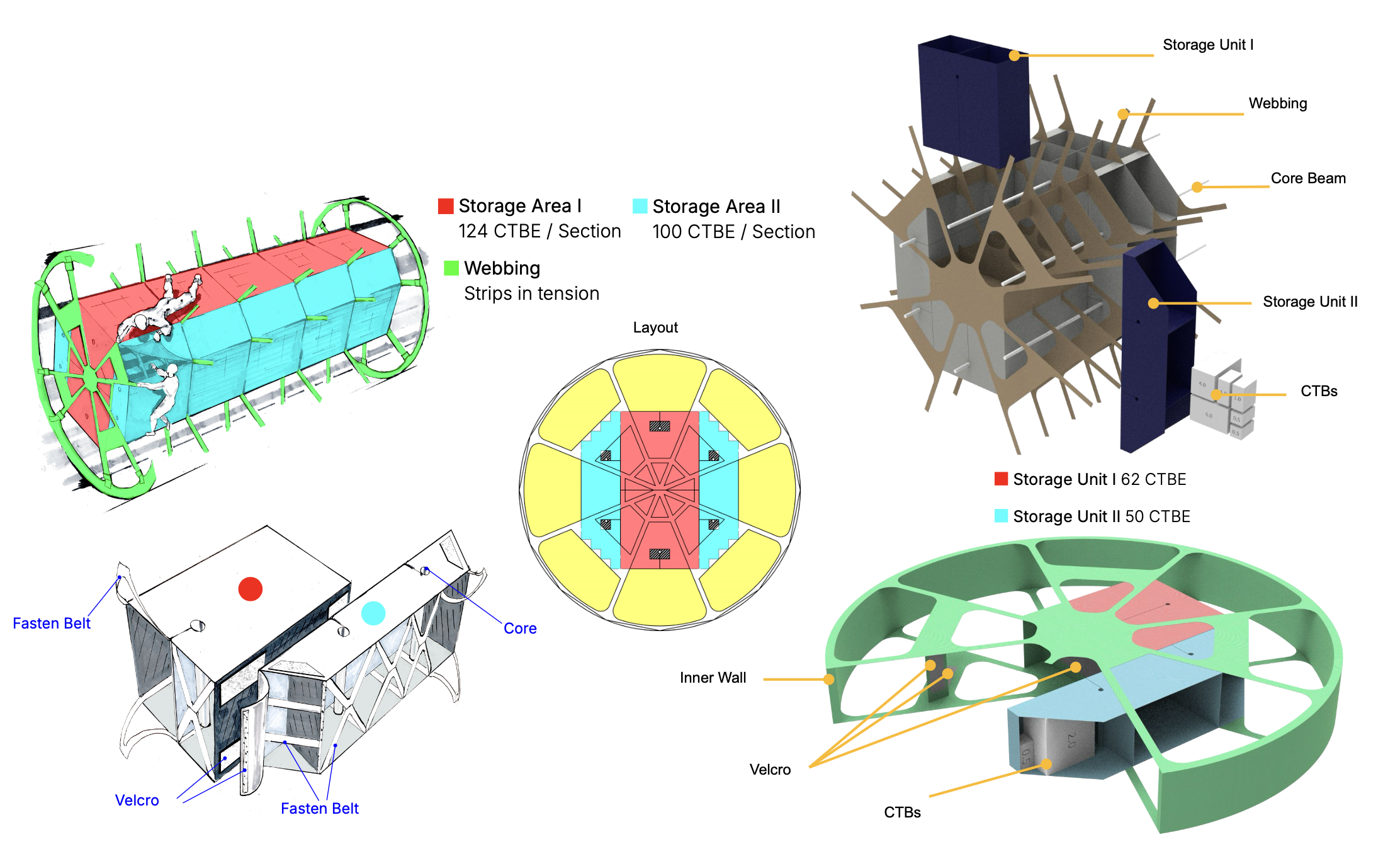 Features and Benefits: This prototype showcases our modular storage unit designed for inflatable habitats. Each unit fits CTBs from 0.5 to 6.0 and attaches to a tensioned inner frame using Velcro. Buckles secure the load, while designated zones separate short-term and long-term storage. The system is reconfigurable, lightweight, and optimized for astronaut access in microgravity.